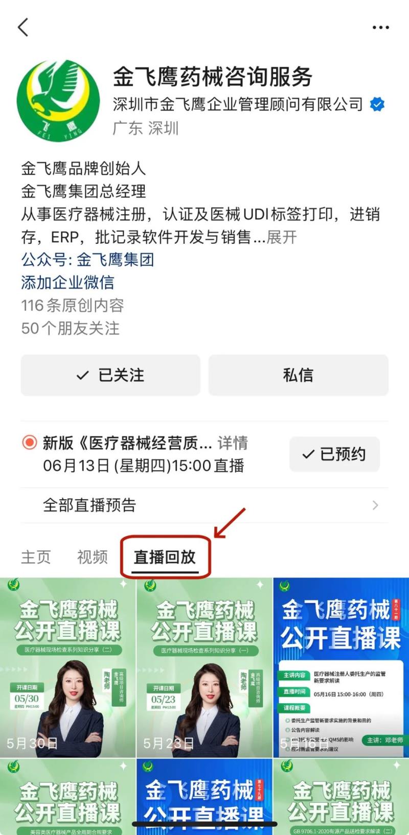 往期直播培訓課程支持回放,關注“金飛鷹藥械咨詢服務”視頻號并點擊視頻號主頁,即可查看“直播回放”