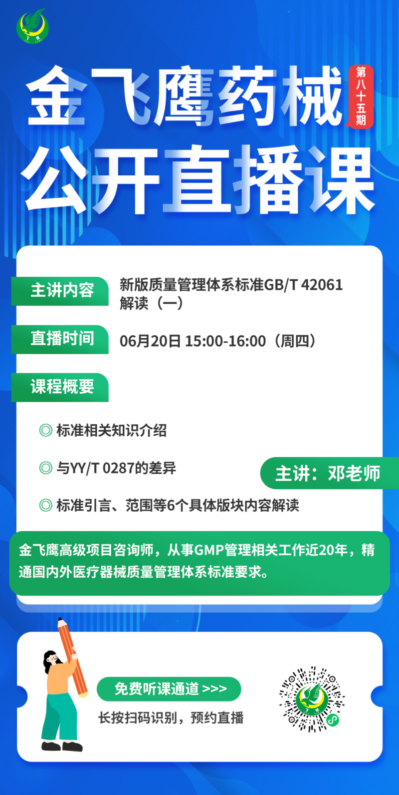 6月20日下午3點,金飛鷹高級項目咨詢師,從事GMP管理相關工作近20年,精通國內外醫療器械質量管理體系標準要求的鄧老師,給大家帶來《新版醫療器械質量管理體系標準GB/T 42061解讀(一)》,培訓內容包標準相關知識介紹、與YY/T 0287的差異、標準引言/范圍等6個具體版塊內容解讀,醫療器械經營企業千萬不要錯過了哦!