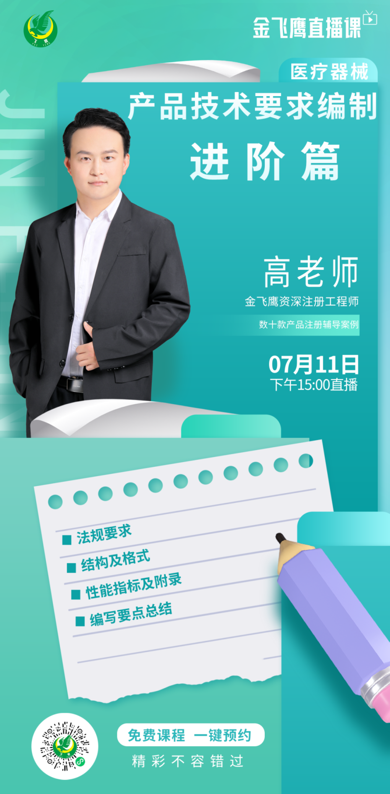 7月11日下午3點,金飛鷹資深注冊工程師,擁有多年醫療器械行業經驗,成功輔導數十款產品合規上市的高老師,給大家帶來《醫療器械產品技術要求編制-進階篇,培訓內容包括法規要求、結構及格式、性能指標及附錄、編寫要點總結,大家千萬不要錯過了哦!
