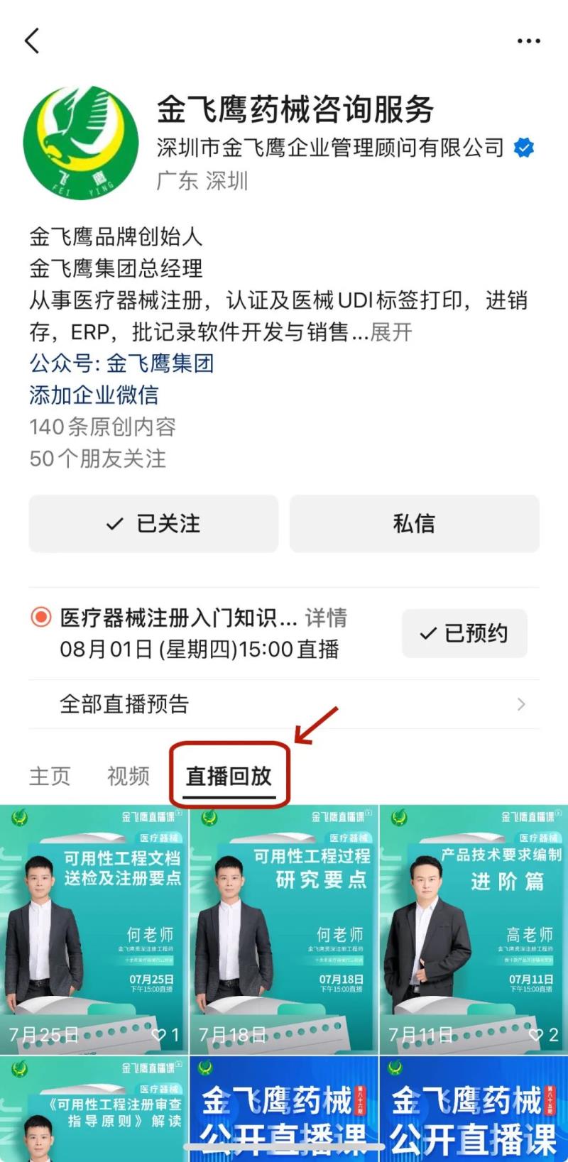 往期直播培訓(xùn)課程支持回放,關(guān)注“金飛鷹藥械咨詢服務(wù)”視頻號并點擊視頻號主頁,即可查看“直播回放”哦~