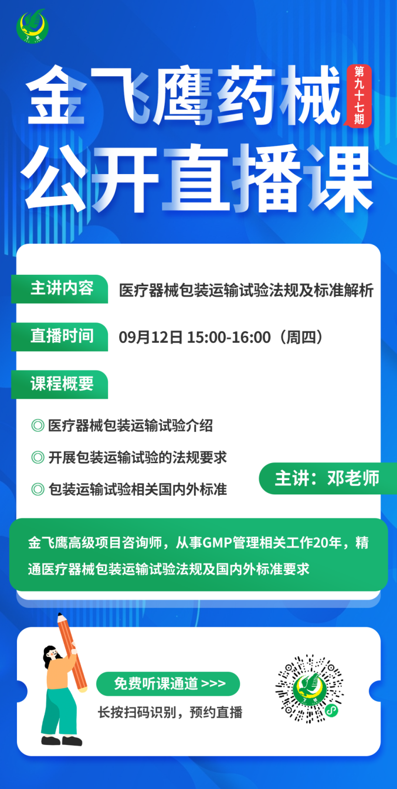 9月12日下午3點,金飛鷹高級項目咨詢師,從事GMP管理相關(guān)工作20年,精通醫(yī)療器械包裝運輸試驗法規(guī)及國內(nèi)外標(biāo)準(zhǔn)要求的鄧?yán)蠋?/span>給大家?guī)怼夺t(yī)療器械包裝運輸試驗法規(guī)及標(biāo)準(zhǔn)解析培訓(xùn)內(nèi)容包醫(yī)療器械包裝運輸試驗介紹、展包裝運輸試驗的法規(guī)要求、包裝運輸試驗相關(guān)國內(nèi)外標(biāo)準(zhǔn),大家千萬不要錯過了!