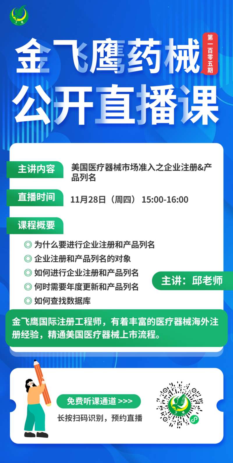 金飛鷹直播培訓,是每周一次的固定培訓欄目,優選金飛鷹國內外資深注冊/項目老師定期為大家講解醫療器械注冊相關知識,解答大家在醫療器械注冊過程中的諸多疑問。