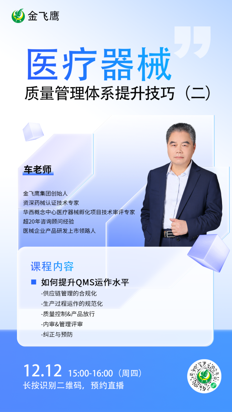 金飛鷹直播培訓,是每周一次的固定培訓欄目,優選金飛鷹國內外資深注冊/項目老師定期為大家講解醫療器械注冊相關知識,解答大家在醫療器械注冊過程中的諸多疑問。