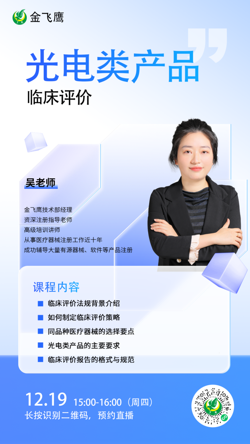 金飛鷹直播培訓,是每周一次的固定培訓欄目,優選金飛鷹國內外資深注冊/項目老師定期為大家講解醫療器械注冊相關知識,解答大家在醫療器械注冊過程中的諸多疑問。