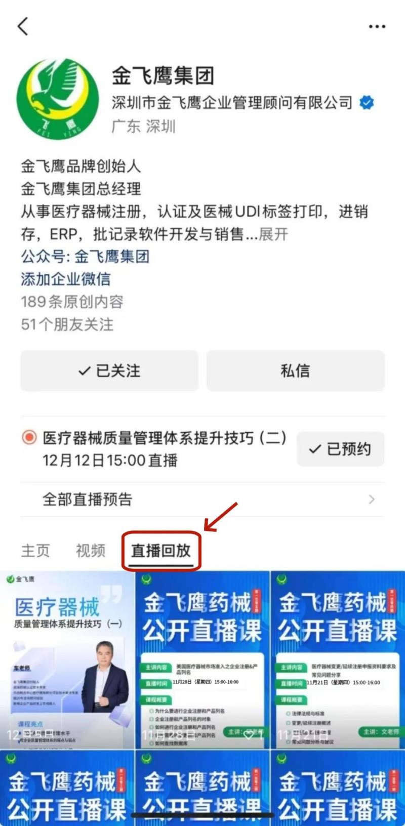往期直播培訓課程支持回放,關注“金飛鷹藥械咨詢服務”視頻號并點擊視頻號主頁,即可查看“直播回放”哦~