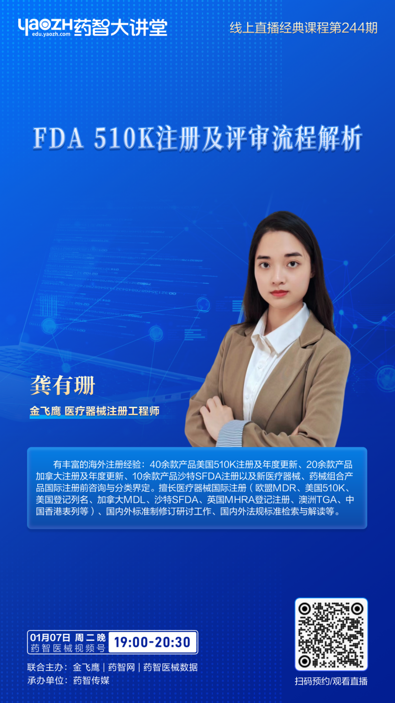 本著與業內各合作機構互通有無的原則,2025年1月7日19:00,我們即將聯合藥智網、藥智醫械數據,給大家帶來了一場《FDA 510(k)注冊及評審流程解析》的線上直播課程分享。