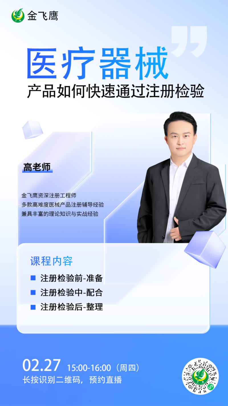 2月27日下午3點(diǎn),金飛鷹資深注冊(cè)工程師、有著多款高難度醫(yī)械產(chǎn)品注冊(cè)輔導(dǎo)經(jīng)驗(yàn)的高老師給大家?guī)怼夺t(yī)械產(chǎn)品如何快速通過注冊(cè)檢驗(yàn),他將從產(chǎn)品注冊(cè)檢驗(yàn)的前、中、后三個(gè)階段,結(jié)合實(shí)際案例為大家一一講解注意事項(xiàng),為企業(yè)提供可操作性的建議,助力企業(yè)成功跨越注冊(cè)檢驗(yàn)的“最后一公里”。