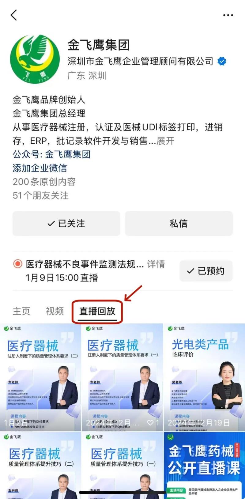 往期直播培訓(xùn)課程支持回放,關(guān)注“金飛鷹藥械咨詢服務(wù)”視頻號(hào)并點(diǎn)擊視頻號(hào)主頁,即可查看“直播回放”哦~