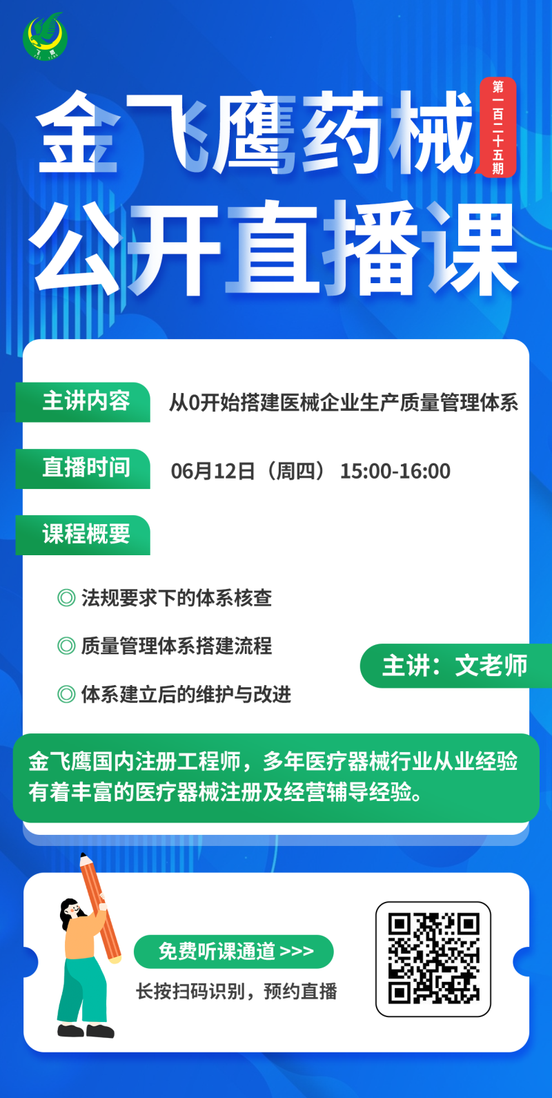 6月12日下午3點,金飛鷹國內注冊工程師、有著豐富醫療器械注冊及經驗輔導經驗的文老師給大家帶來《從0開始搭建醫械企業生產質量管理體系》,感興趣的朋友記得提前預約,我們直播間不見不散~
