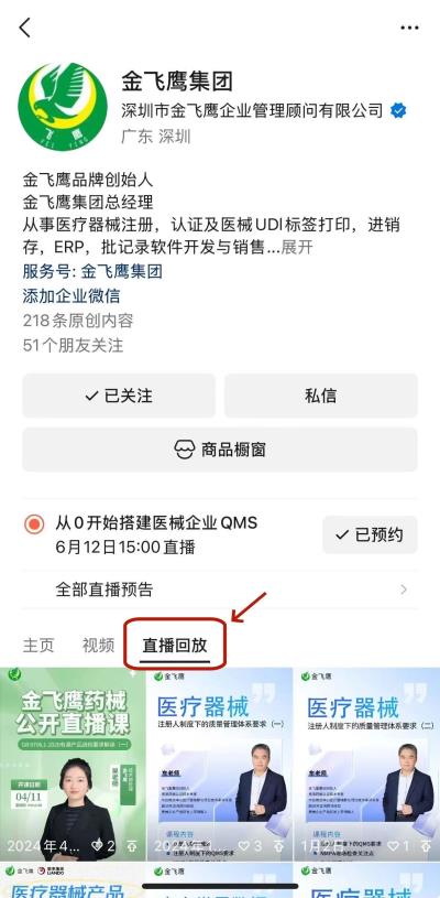 往期直播培訓課程支持回放,關注“金飛鷹藥械咨詢服務”視頻號并點擊視頻號主頁,即可查看“直播回放”哦~