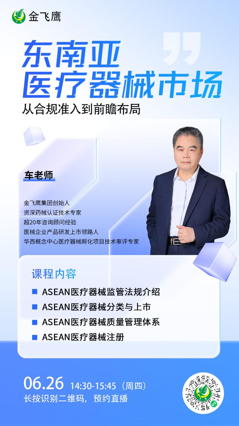 為助力國內醫療器械企業把握這一黃金機遇,我們聯合成都高新區數智醫療創新聯盟特別策劃了“瀾湄醫貿新航道——中國-東南亞器械出口政策解析與市場掘金沙龍”,本場沙龍即將于6月26日14:00在成都前沿醫學中心E1棟二層巴黎路演廳舉行,屆時將由金飛鷹集團創始人車老師跟大家分享東南亞醫療器械市場準入要求,同時,多家協辦單位專家將聯袂帶來國際經貿形勢分析及風險應對、出口外貿企業金融政策等干貨內容,與參會企業共同探討市場準入要點、產品定位策略及本地化運營方案,助力醫療器械企業把握政策紅利窗口期,共享東南亞市場掘金機遇!