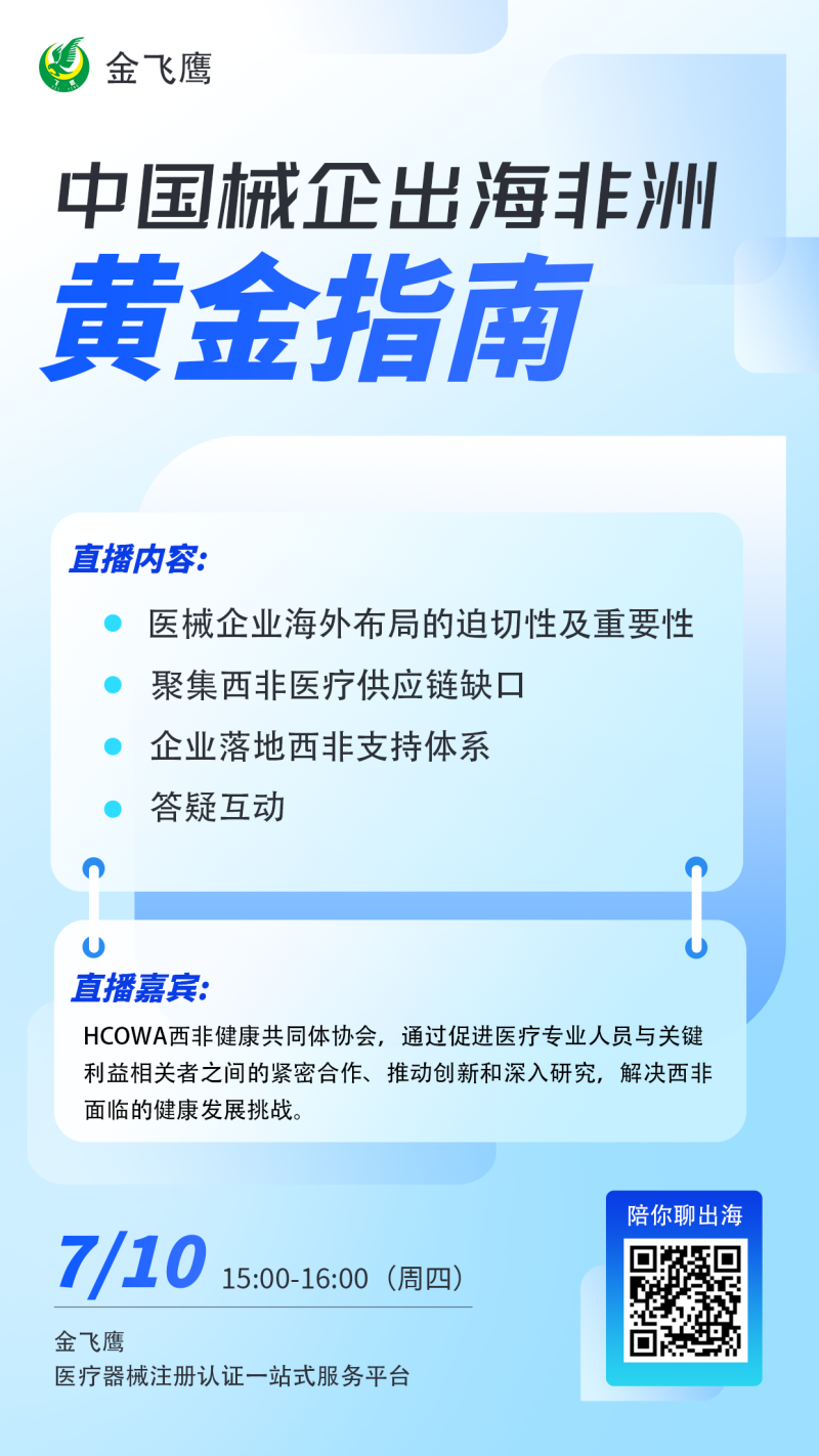 在此背景下,7月10日下午3點,我們特別聯合HCOWA西非健康共同體協會,給大家帶來一場中國械企出海非洲指南的直播,為您解鎖西非醫療市場的財富密碼!本期直播將從西非醫療市場需求、西非供應鏈缺口、企業落地西非的相關支持體系等方面進行分享,與各位共拓西非的掘金版圖,感興趣的朋友記得提前預約!