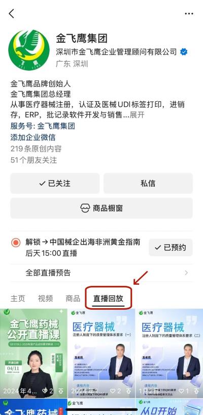 往期直播培訓課程支持回放,關注“金飛鷹藥械咨詢服務”視頻號并點擊視頻號主頁,即可查看“直播回放”哦~