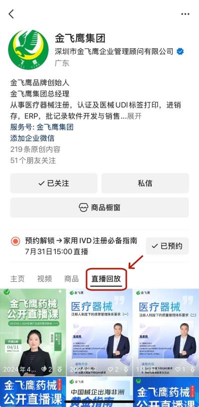 往期直播培訓課程支持回放,關注“金飛鷹藥械咨詢服務”視頻號并點擊視頻號主頁,即可查看“直播回放”哦~