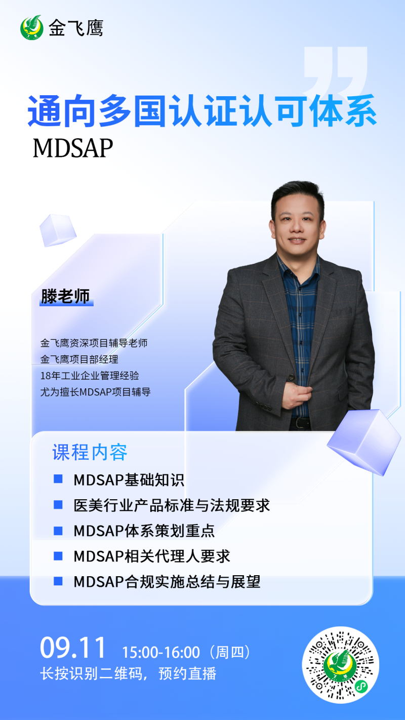 9月11日下午3點,金飛鷹高級項目咨詢師、有著諸多MDSAP項目輔導經驗的滕老師,給大家深入淺出地講解MDSAP審核的核心邏輯與應對技巧,讓您不僅“知其然,更“知其所以然!感興趣的朋友記得提前預約,鎖定這場合規必修課!
