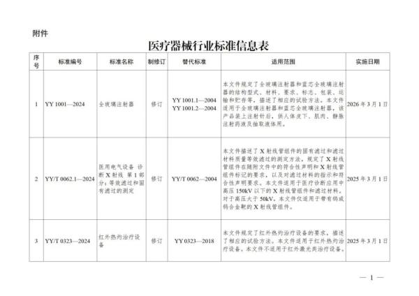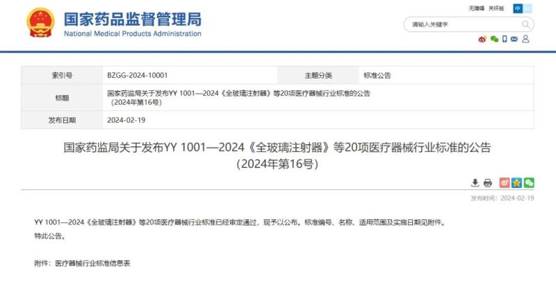 2月19日,國家藥監局發布YY 1001-2024《全玻璃注射器》、YY/T 0853-2024《醫用靜脈曲張壓力襪》等20項醫療器械行業標準(最早自2025年3月1日起實施),具體如下: