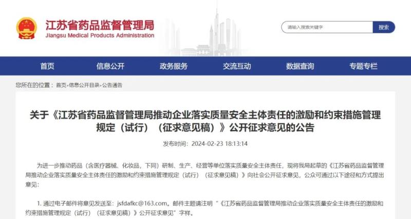 近日,江蘇省藥監(jiān)局發(fā)布《江蘇省藥品監(jiān)督管理局推動企業(yè)落實質(zhì)量安全主體責(zé)任的激勵和約束措施管理規(guī)定(試行)(征求意見稿)》(以下簡稱《管理規(guī)定》),擬對“兩品一械”企業(yè)進行質(zhì)量安全評級管理,并向社會公開征求意見。