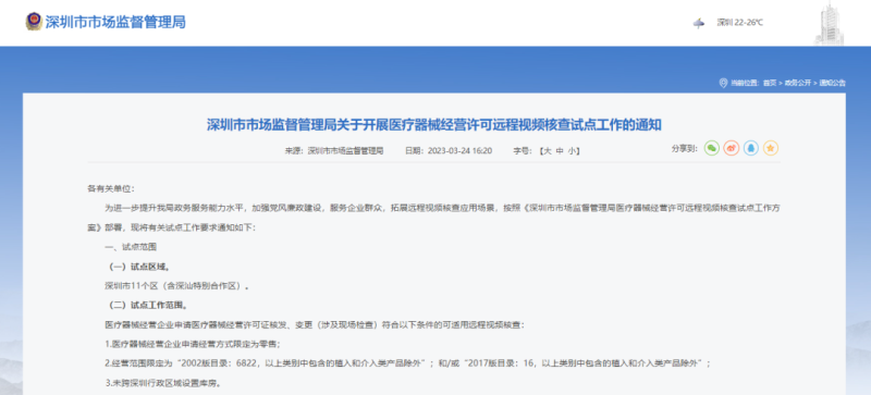 3月24日,深圳市市場監督管理局發布《關于開展醫療器械經營許可遠程視頻核查試點工作的通知,具體內容如下: