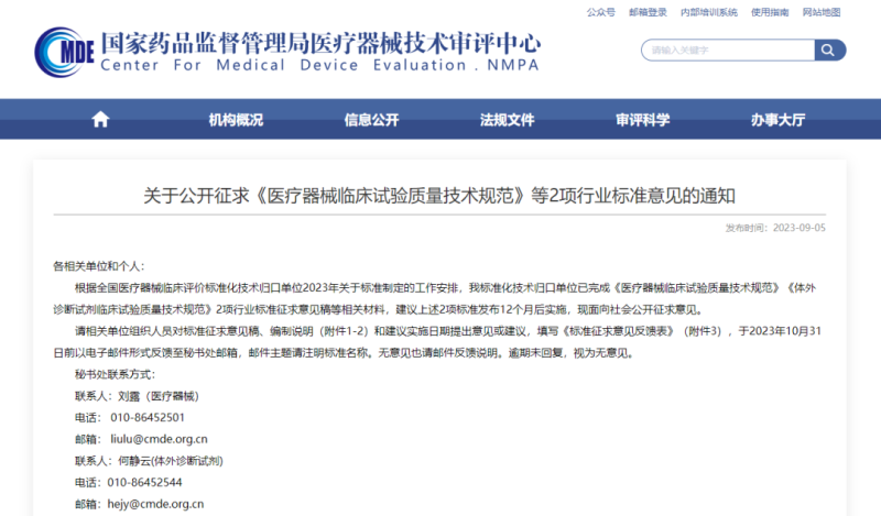 9月5日,國家藥監局器審中心發布《醫療器械臨床試驗質量技術規范》《體外診斷試劑臨床試驗質量技術規范》共2項行業標準征求意見稿,并向社會公開征求意見。