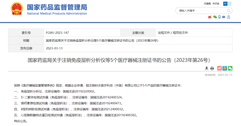 3月13日,國家藥監局官網發布公告稱,按照《醫療器械監督管理條例》規定,根據企業申請,注銷積水醫療科技(中國)有限公司的免疫層析分析儀等5個產品的醫療器械注冊證,具體如下: