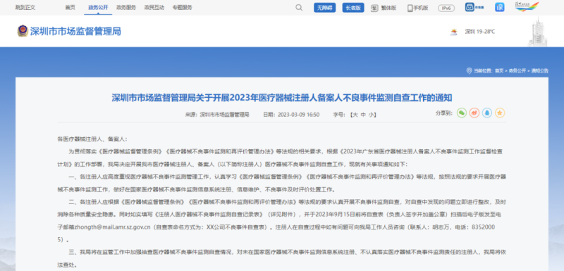 3月9日,深圳市市場監督管理局官網發布《關于開展2023年醫療器械注冊人備案人不良事件監測自查工作的通知》,具體內容如下: