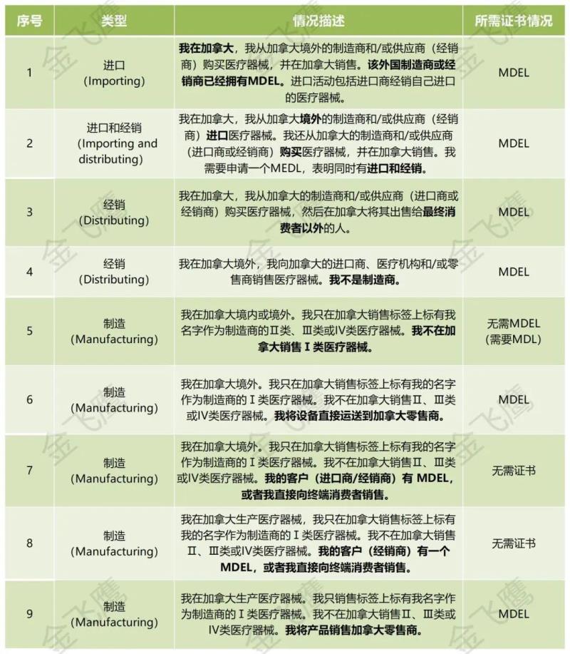 對比2020年版指南文件[ Guidance on Medical Device Establishment Licensing (GUI-0016) version 8(April 1, 2020)],要求持有MDEL的情形(指南文件表1)稍有變動,我們將最新表格翻譯轉載如下: