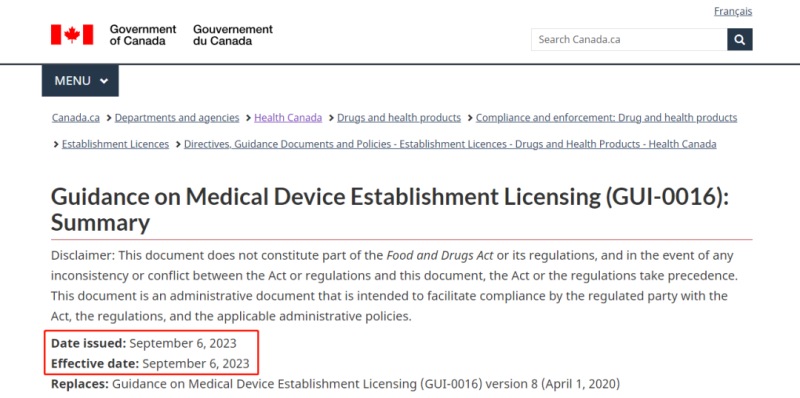 9月6日,加拿大更新了與醫療器械企業許可證(Medical Device Eestablishment Licensing)相關的監管要求指南文件。