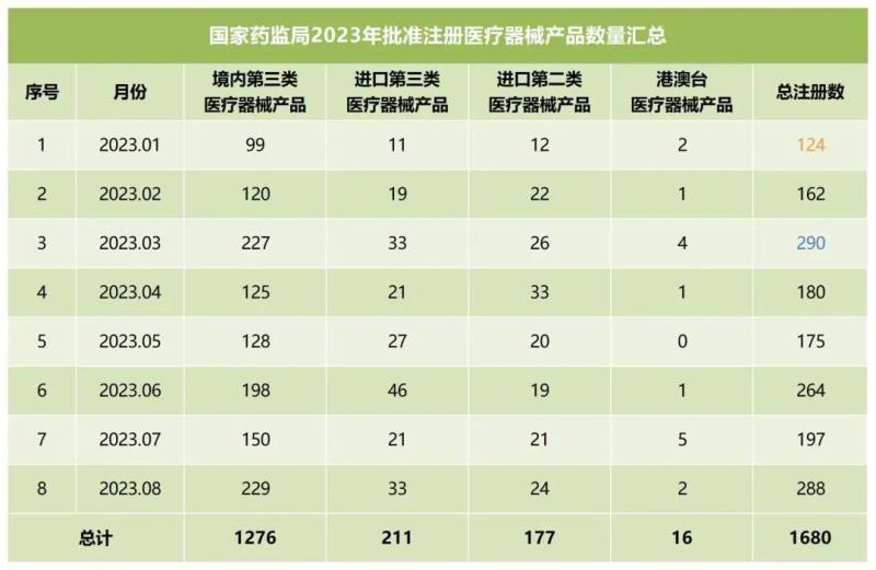 據國家藥監局官網近日發布,2023年8月,國家藥監局共批準注冊醫療器械產品288個。其中,境內第三類醫療器械產品229個,進口第三類醫療器械產品33個,進口第二類醫療器械產品24個,港澳臺醫療器械產品2個。