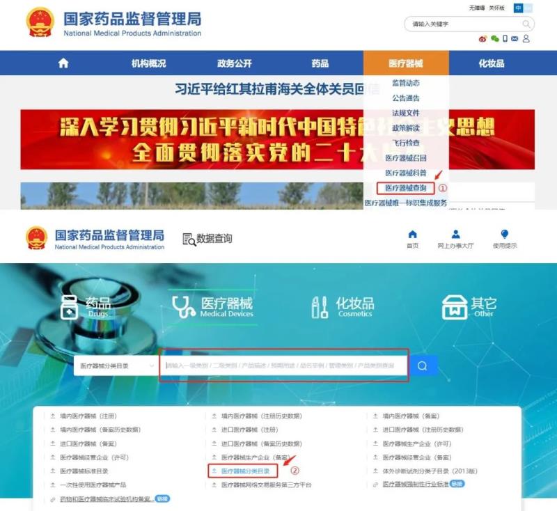 進入國家藥監局(https://www.nmpa.gov.cn/)網站,在首頁菜單中選擇“醫療器械”欄,并于下拉菜單中點擊“醫療器械查詢”,進入頁面后點擊“醫療器械分類目錄”,即可按產品名稱、產品描述或預期用途等對產品類別進行查詢。