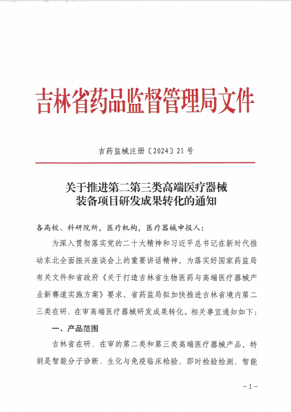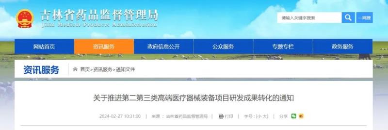 2月27日,吉林省藥監局發布《關于推進第二第三類高端醫療器械裝備項目研發成果轉化的通知》(以下簡稱《通知》),擬加快推進吉林省境內第二三類在研、在審高端醫療器械研發成果轉化。