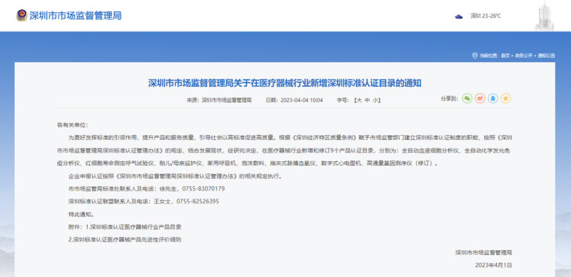 4月4日,深圳市市場監督管理局官網發布《關于在醫療器械行業新增深圳標準認證目錄的通知》(以下簡稱《通知》)。《通知》指出,在醫療器械行業新增和修訂9個產品認證目錄,分別為:全自動血液細胞分析儀、全自動化學發光免疫分析儀、紅細胞壽命測定呼氣試驗儀、胎兒/母親監護儀、家用呼吸機、泡沫敷料、指夾式脈搏血氧儀、數字式心電圖機、高通量基因測序儀(修訂)。《通知》中提到的有關先進性評價細則等附件,大家可點擊文末“閱讀原文”查看。