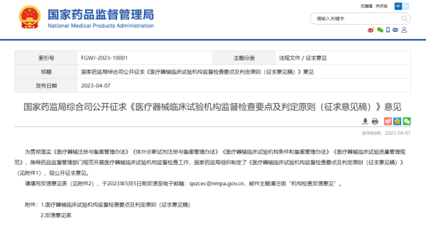 4月7日,國家藥監局官網發布《醫療器械臨床試驗機構監督檢查要點及判定原則(征求意見稿)》(以下簡稱《檢查要點》),并向社會公開征求意見。