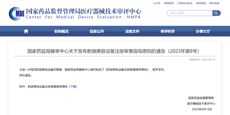 4月12日,國家藥監局器審中心在原有征求意見稿基礎上正式發布《射頻美容設備注冊審查指導原則》,我們將部分重點內容摘錄如下:
