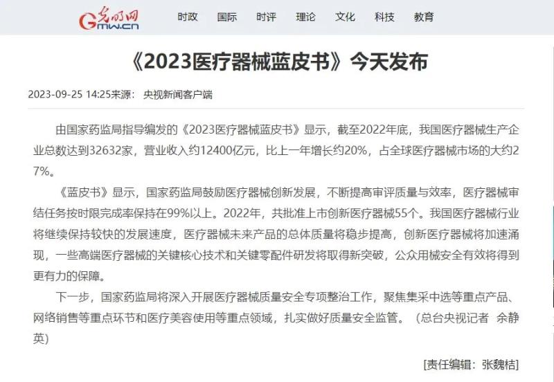 近日,由國家藥監局指導編發的《2023 醫療器械藍皮書》顯示,截至 2022 年底,我國醫療器械生產企業總數達到 32632 家,營業收入約 12400 億元,比上一年增長約 20%,占全球醫療器械市場的大約 27%。