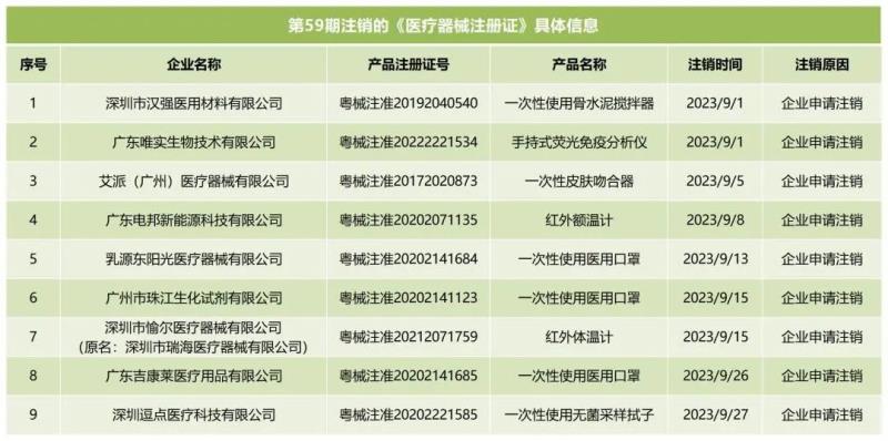 10月7日,廣東省藥監(jiān)局官網(wǎng)發(fā)布通告稱,該局已依法注銷“粵械注準20192040540”等9個醫(yī)療器械注冊證,包括廣東唯實生物技術(shù)有限公司的手持式熒光免疫分析儀、廣東電邦新能源科技有限公司的紅外額溫計、廣東吉康萊醫(yī)療用品有限公司的一次性使用醫(yī)用口罩等產(chǎn)品,具體明細如下:排版整理:金飛鷹藥械