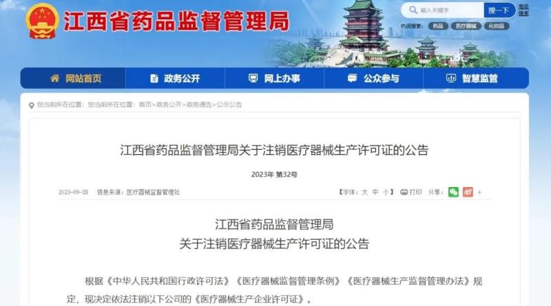 江西藥監局:以下醫療器械生產許可證已被注銷!