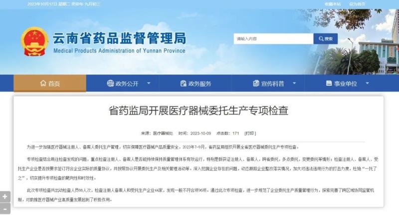 近日,云南省藥監局官網發布動態稱,2023年7-9月,該局組織開展了全省醫療器械委托生產專項檢查。