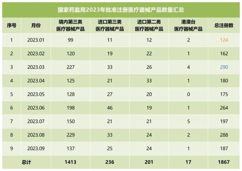 我們同步匯總了2023年各個月份國家藥監局批準注冊的醫療器械產品數量(見下方表格),從表格中可以看出,截至9月,2023年國家藥監局總計批準注冊醫療器械產品1867,其中境內第三類醫療器械產品1413個,進口第三類醫療器械產品236個第三類醫療器械產品總計1649個),進口第二類醫療器械產品201個,港澳臺醫療器械產品17個