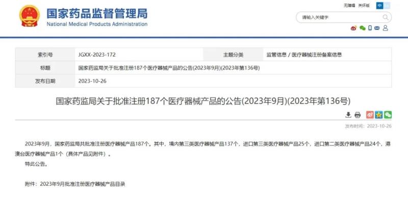 10月26日,國家藥監局官網發布公告稱,2023年9月,國家藥監局共批準注冊醫療器械產品187個其中,境內第三類醫療器械產品137個,進口第三類醫療器械產品25個,進口第二類醫療器械產品24個,港澳臺醫療器械產品1