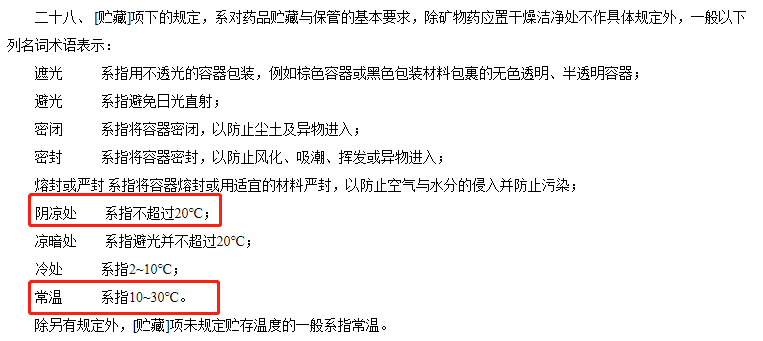 根據國家藥監局食品藥品審核查驗中心的回復,參照《中國藥典》(2020年版)第一部“凡例”中內容:“陰涼處系指不超過20℃”、“常溫系指10~30℃”,建議企業可根據自身產品存儲溫度要求借鑒參考。
