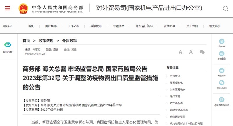 自本公告發布之日起,商務部、海關總署、國家藥監局2020年第5號公告(《關于有序開展防疫物資出口的公告》)及商務部、海關總署、市場監管總局2020年第12號公告(《關于進一步加強防疫物資出口質量監管的公告》)同時廢止。有關防疫物資出口企業要確保產品質量安全、符合相關標準要求,自覺維護中國產品國際聲譽。