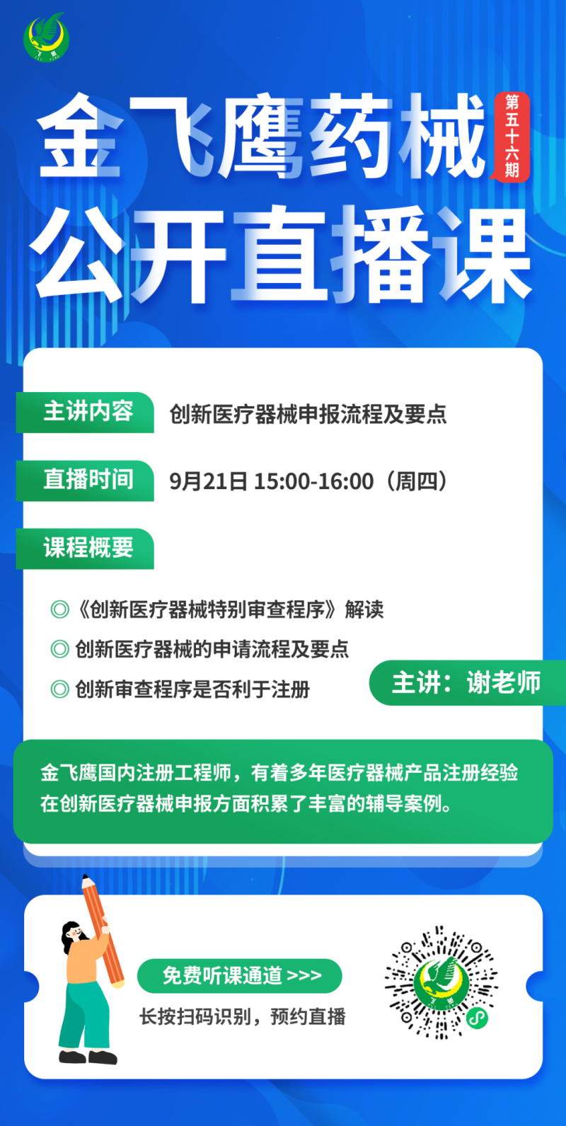 9月21日下午3點,金飛鷹國內注冊工程師,有著多年醫療器械產品注冊經驗,在創新醫療器械申報方面積累了豐富輔導案例的謝老師,給大家帶來《創新醫療器械申報流程及要點》,培訓內容包括《創新醫療器械特別審查程序》解讀、創新醫療器械的申請流程及要點、創新審查程序是否利于注冊等,大家千萬不要錯過了哦!
