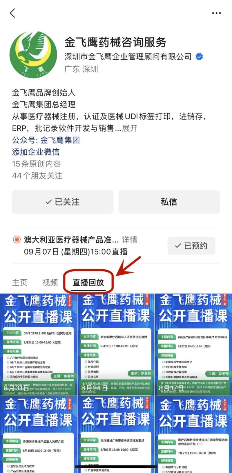 往期直播培訓課程支持回放,關注“金飛鷹藥械咨詢服務”視頻號并點擊視頻號主頁,即可查看“直播回放”哦~