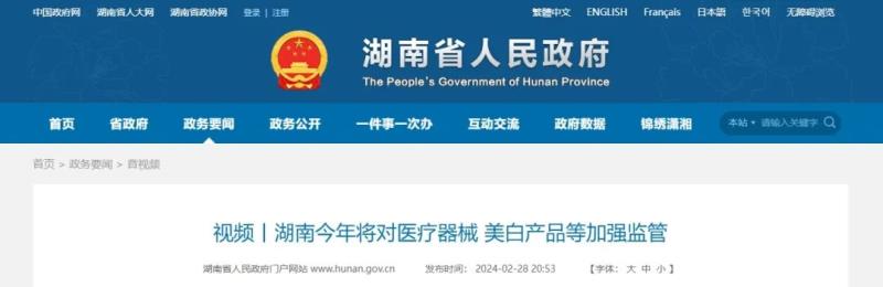 2月28日,湖南省人民政府發布一則視頻,其中提到,據湖南省藥品監管局發布,今年(2024年),全省藥品監管部門將聚焦突出問題和薄弱環節,堅持對生化藥品、兒童用藥、防疫用藥、集采中選藥品和醫療器械、美白產品等重點品種、重點企業、重點環節加強監管。