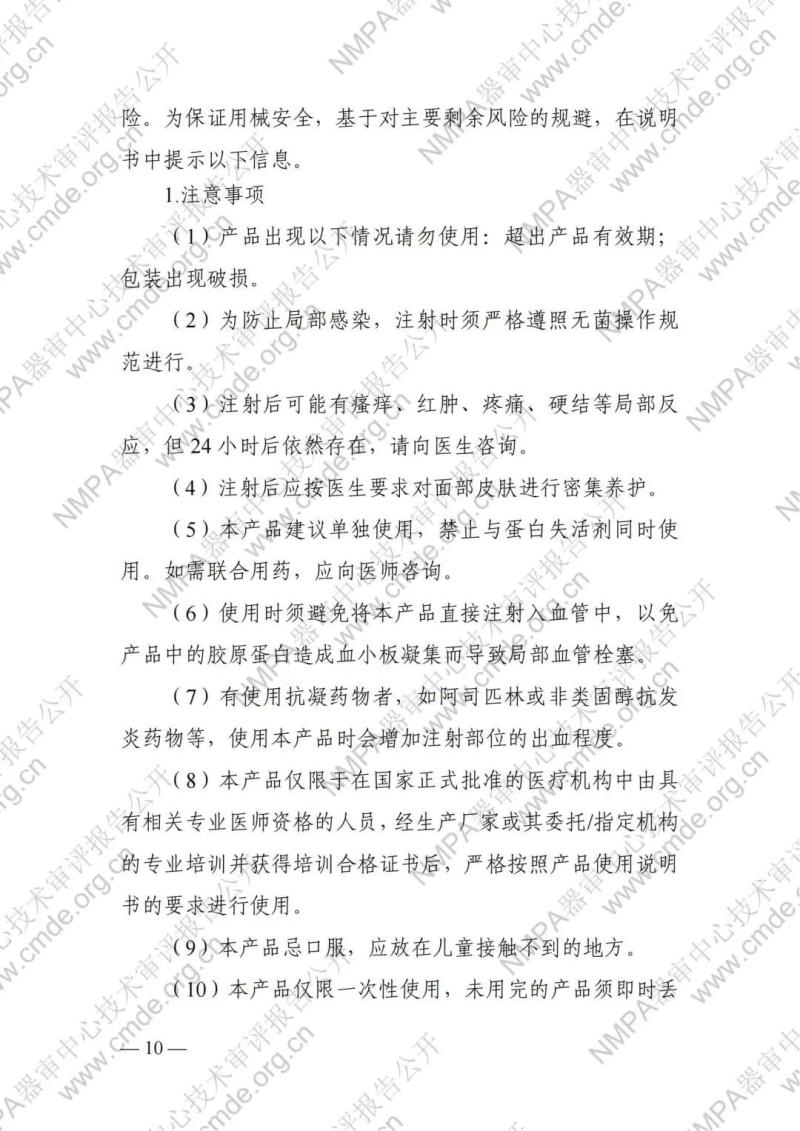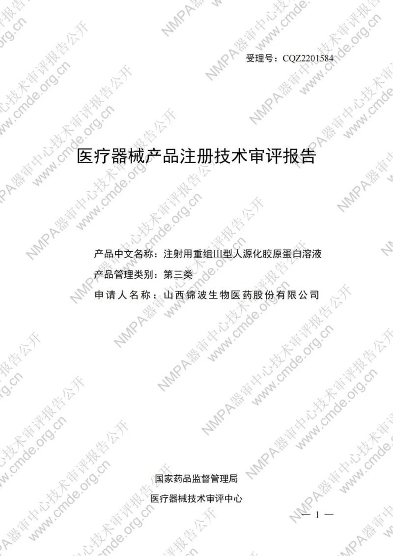 近日,國(guó)家藥監(jiān)局器審中心公開了創(chuàng)新醫(yī)療器械注射用重組Ⅲ型人源化膠原蛋白溶液”的審評(píng)報(bào)告,我們將其以圖片形式轉(zhuǎn)載如下: