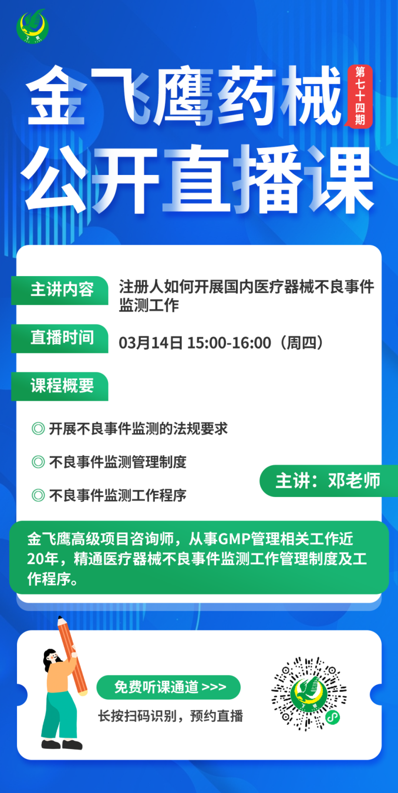 3月14日下午3點(diǎn),金飛鷹高級項(xiàng)目咨詢師,從事GMP管理相關(guān)工作20,精通醫(yī)療器械不良事件監(jiān)測工作管理制度及工作程序的鄧?yán)蠋煟?/span>給大家?guī)怼蹲匀巳绾伍_展國內(nèi)醫(yī)療器械不良事件監(jiān)測工作》,培訓(xùn)內(nèi)容包括醫(yī)療器械不良事件監(jiān)測管理制度、工作程序,感興趣的企業(yè)千萬不要錯(cuò)過了哦