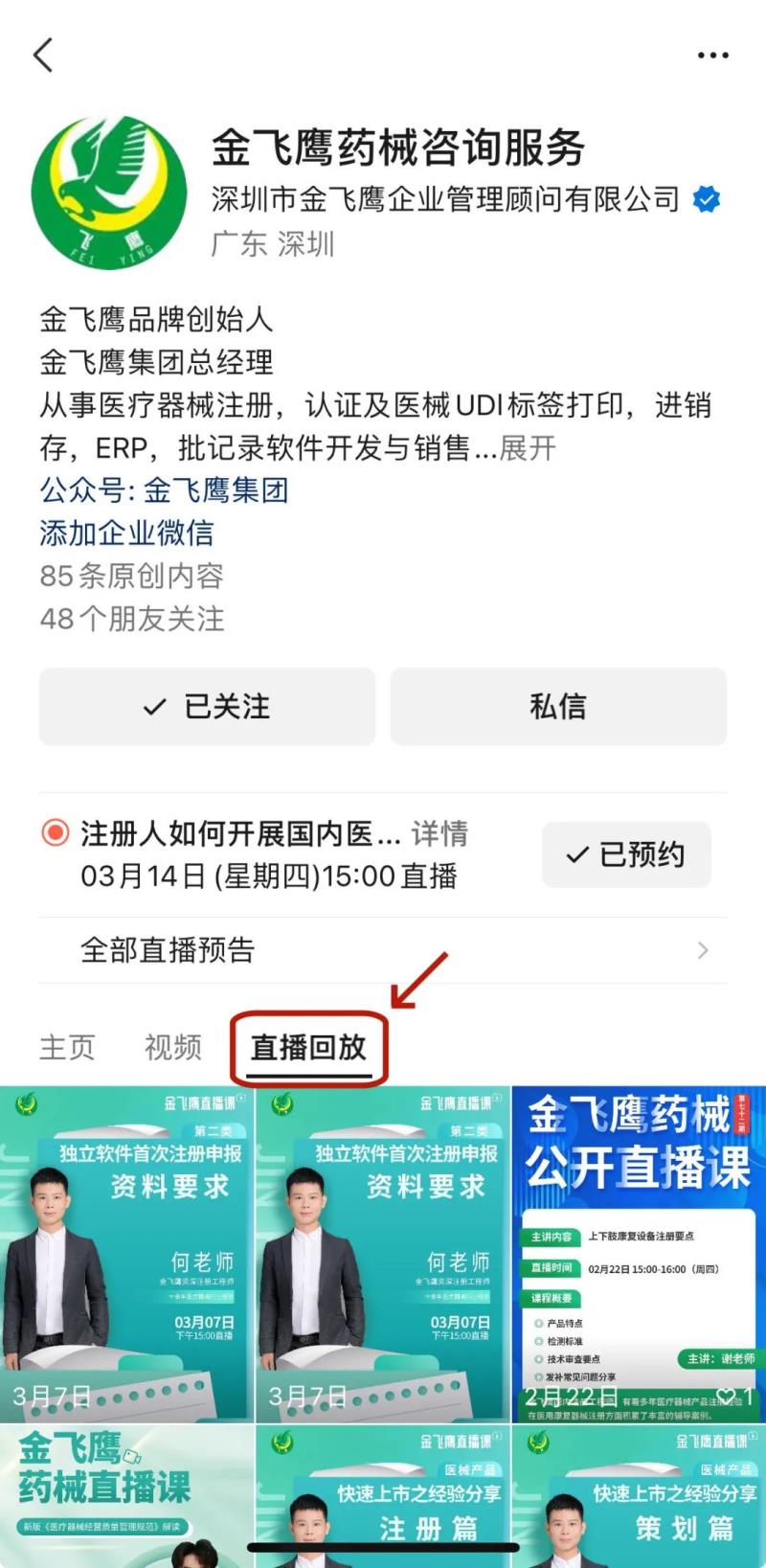 劃重點(diǎn)!往期直播培訓(xùn)課程支持回放,關(guān)注“金飛鷹藥械咨詢服務(wù)”視頻號并點(diǎn)擊視頻號主頁,即可查看“直播回放”哦~
