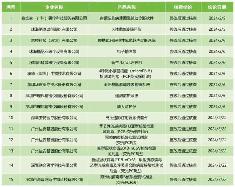 近日,廣東省藥監局官網公布2024年2月醫療器械注冊質量管理體系核查結果,包括廣州達安基因股份有限公司、深圳市科曼醫療設備有限公司、深圳市理邦精密儀器股份有限公司在內的12家企業共計15款產品,均為“整改后通過核查”。具體明細見下方表格: