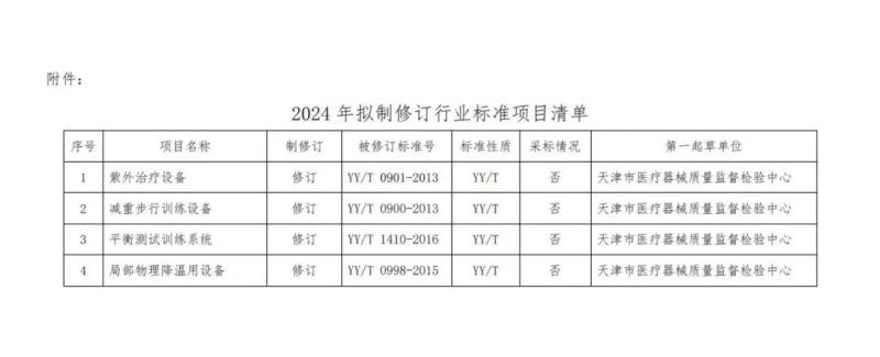 3月19日,國家藥監局醫療器械標管中心轉發了全國醫用電器標準化技術委員會物理治療設備分技術委員會《關于征集2024年度物理治療設備領域擬制修訂醫療器械行業標準計劃項目參與單位的通知》,2024年擬對紫外治療設備、減重步行訓練設備、平衡測試訓練系統、局部物理降溫用設備的行業標準進行制修訂,具體如下: