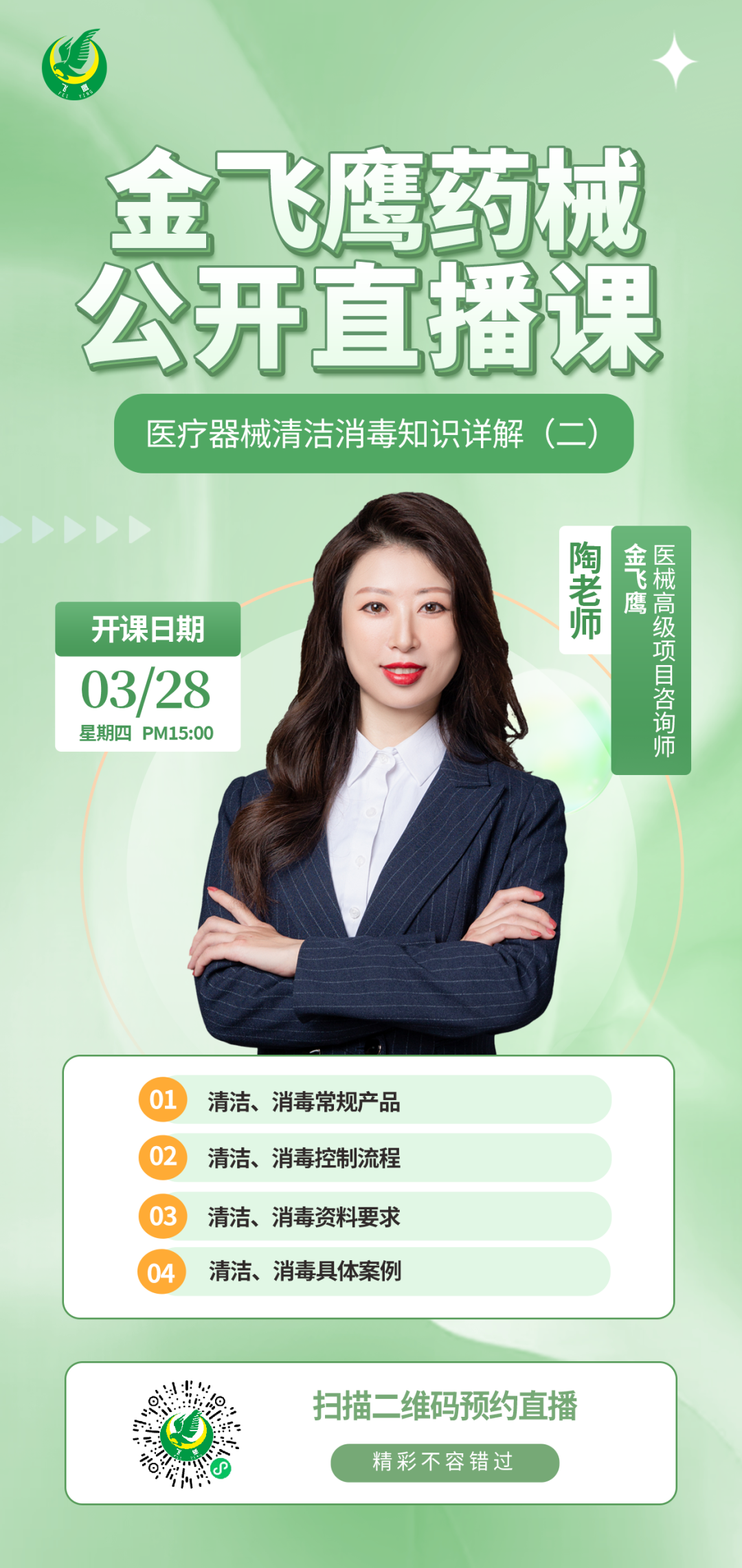 3月28日下午3點,金飛鷹高級項目咨詢師,負責過多種無菌和植入耗材類醫(yī)療器械產(chǎn)品國外委托生產(chǎn)&國內(nèi)技術(shù)轉(zhuǎn)移項目,對醫(yī)療器械消毒滅菌頗有研究的陶老師,繼續(xù)給大家?guī)?/span>《醫(yī)療器械清潔消毒知識詳解(二)》,培訓內(nèi)容包括清潔/消毒常規(guī)產(chǎn)品、清潔/消毒控制流程、清潔/消毒資料要求、清潔/消毒具體案例等,大家千萬不要錯過了哦!